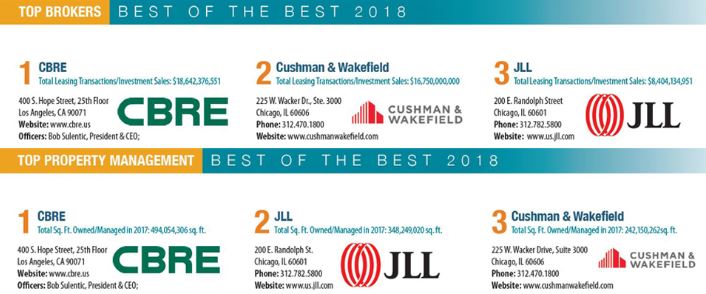 For brokerage, the rankings were based on total leasing transactions and investment sales in the Midwest region (the publication listed $16,750,000,000). For property management, the rankings were based on total square footage (sf) owned and managed in the Midwest region (the publication listed 242,150,262 sf).